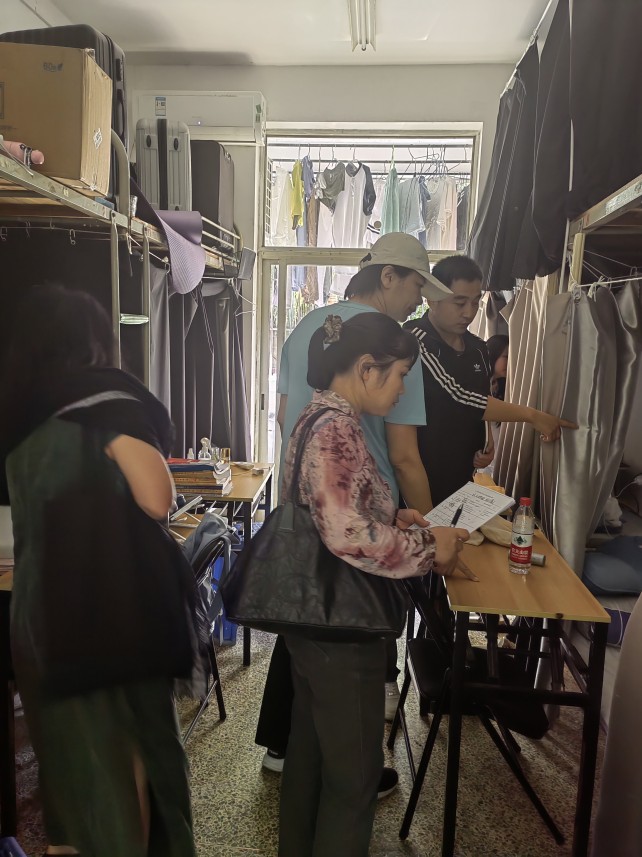 在查看学生宿舍安全隐患整改情况时,柯院长一行和基地管理团队一起,根据校武装保卫部之前排查的宿舍安全隐患台账,逐间对照存在隐患和整改情况,做好检查记录。对已经整改的,要求继续保持,对个别宿舍整改还不到位的,要求加强安全教育,整改到位。发挥教官、辅导员和学生干部三支力量不定期检查,确保学生宿舍消防安全。