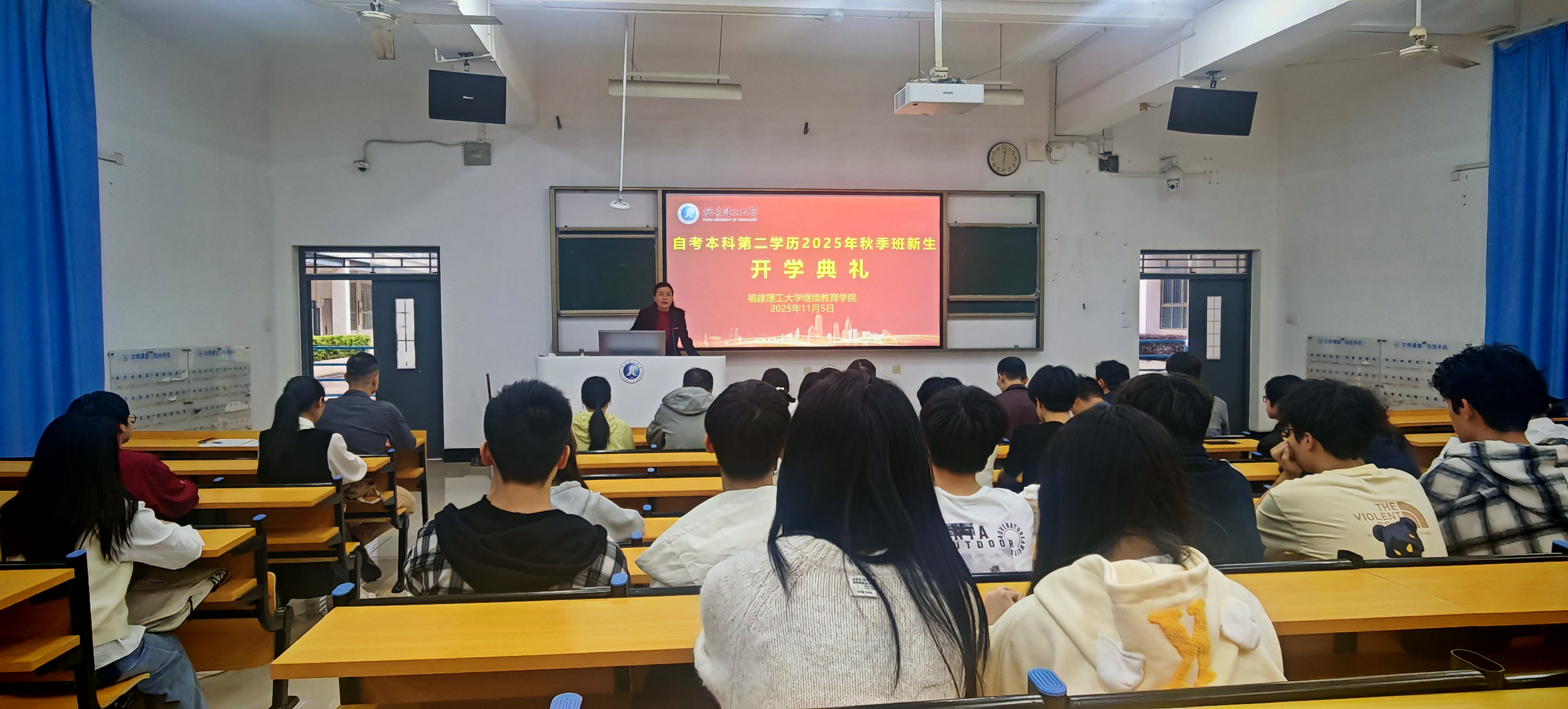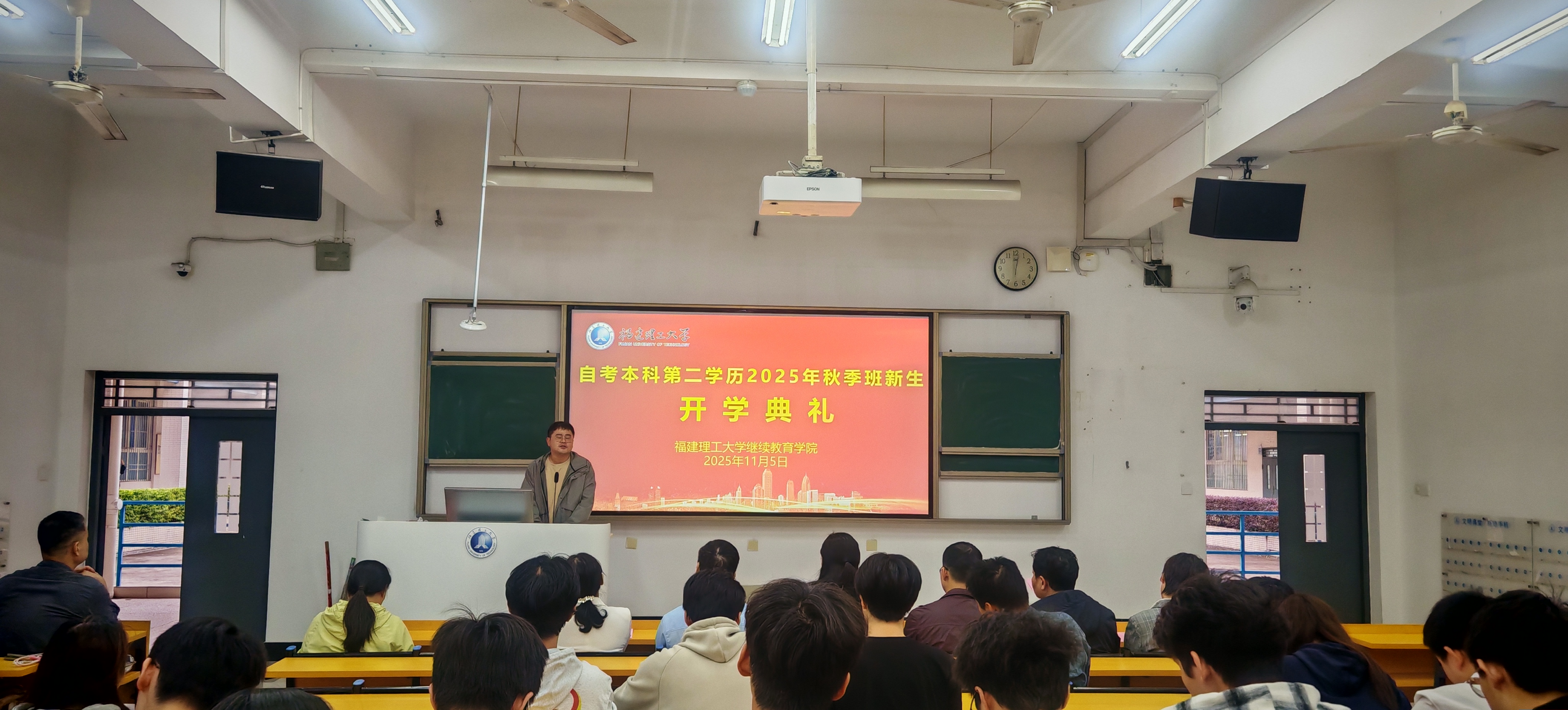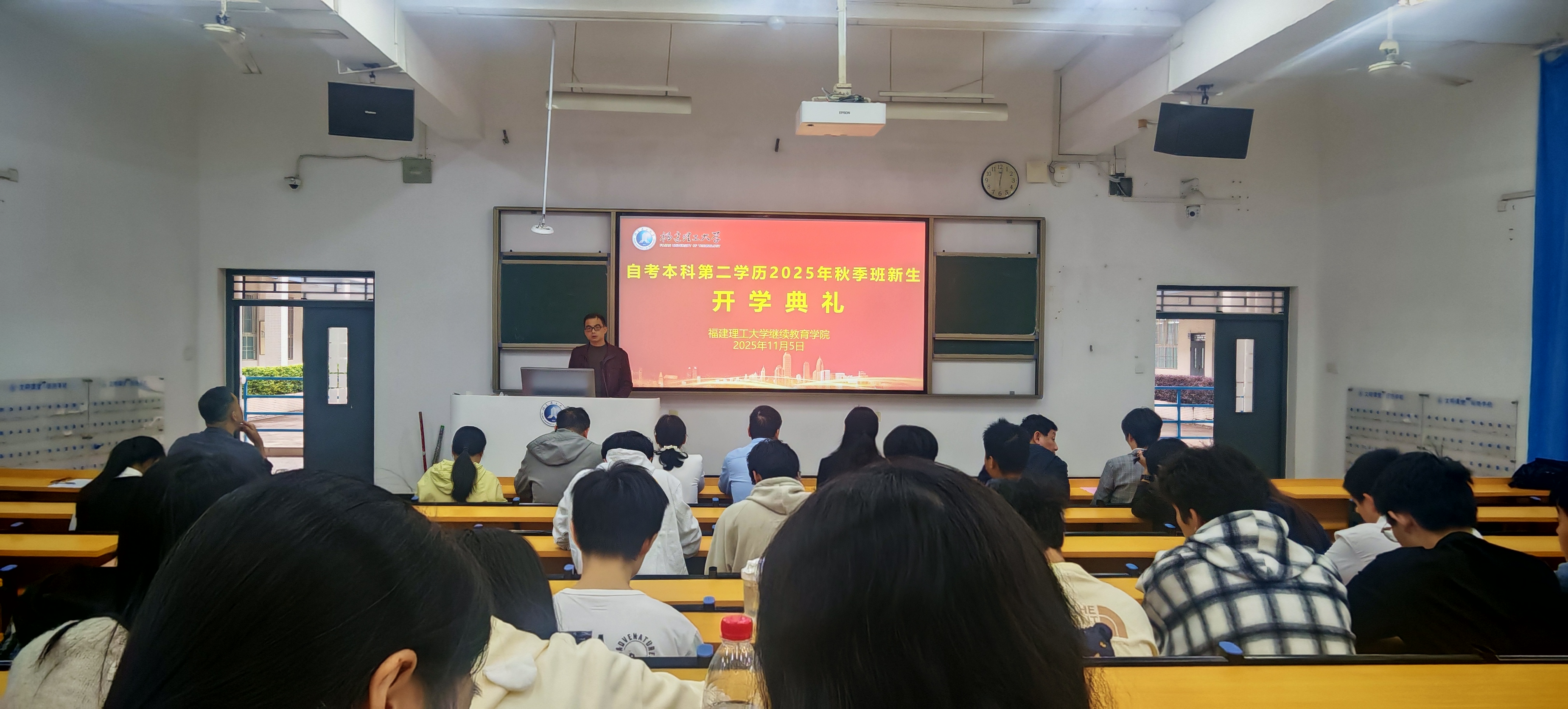 11月5日下午,我校在旗山校区北区大教西—3举行2025年高等学历继续教育自考本科第二学历秋季班新生开学典礼。教务处副处长马刚峰、继续教育学院副院长柯益群、电子电气与物理学院副院长蔡志明、法学院副院长张弘、计算机科学与数学学院副院长唐郑熠以及相关老师出席,自考本科第二学历法学专业、计算机科学与技术专业、电气工程及其自动化专业50多名新生代表参加开学典礼。